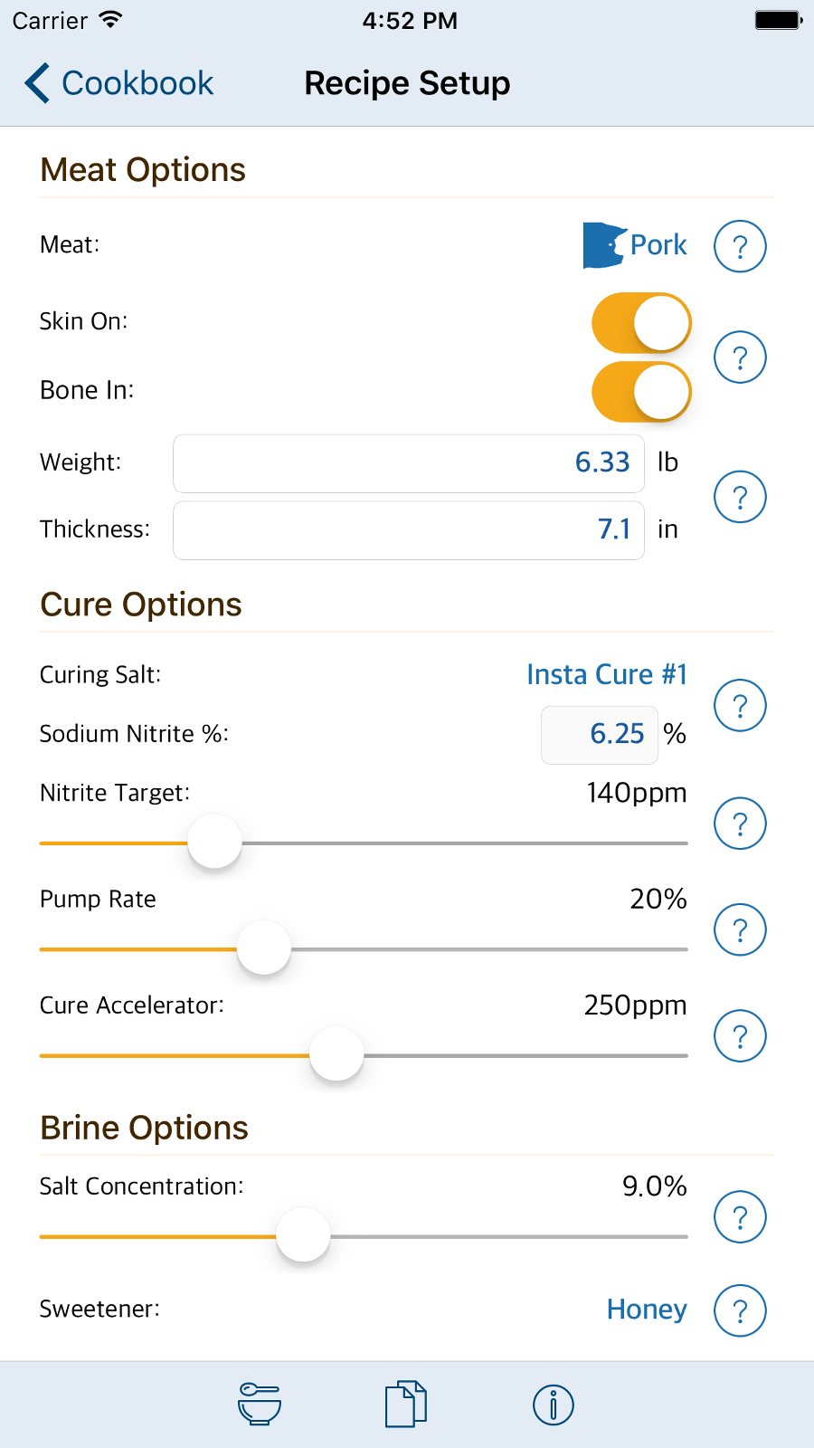 The app calculates the optimal ingredient quantities for the wet curing (also known as brining or pickling) as per your local food standards.